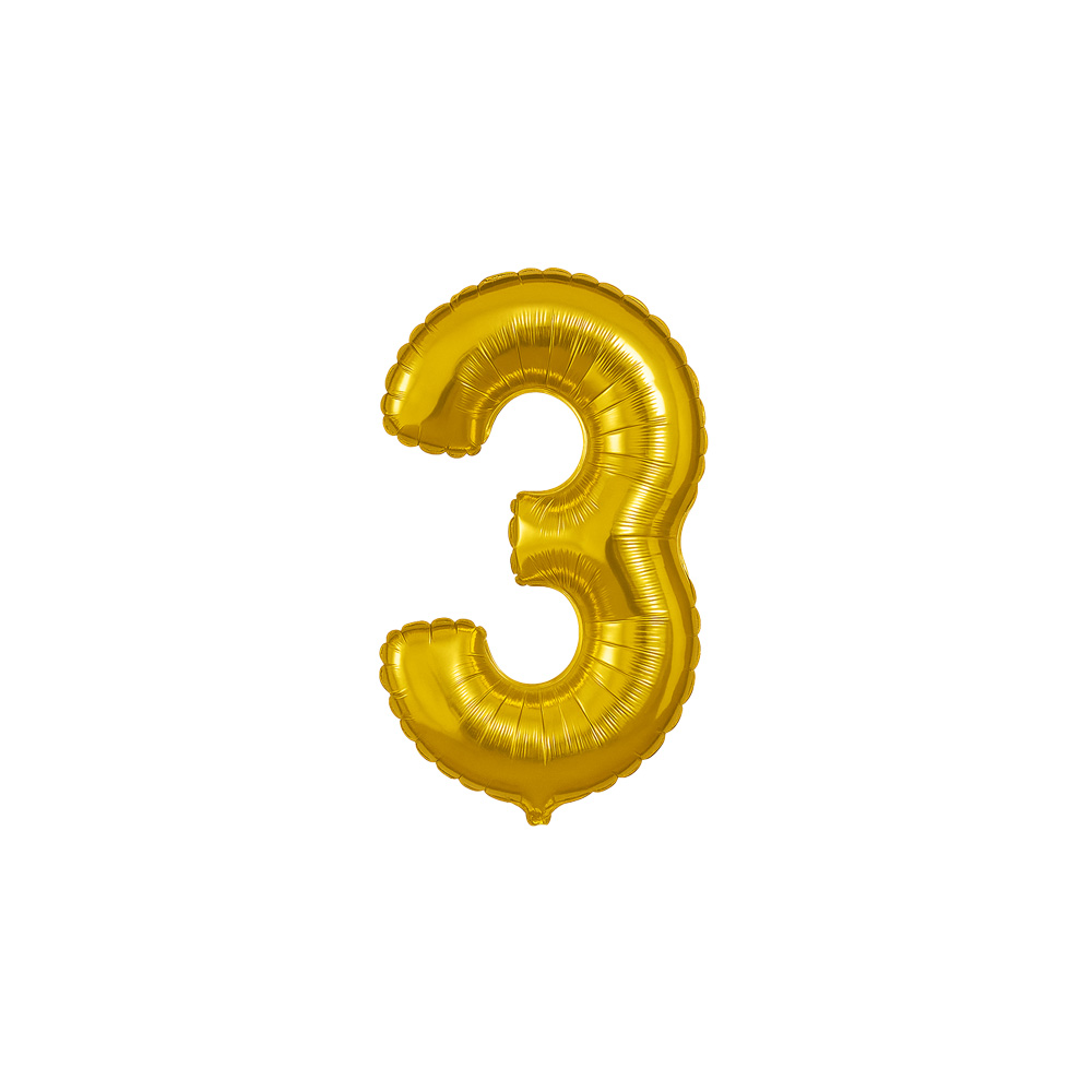 Balonë dekorative në formë numri 3 me ngjyrë të artë metalike. Ideale për ditëlindje, përvjetorë dhe festa të ndryshme. Jep një pamje elegante dhe atmosferë festive çdo eventi.