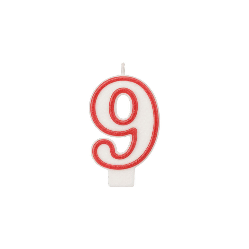 Qiri klasik në formë numri 9, me ngjyrë të bardhë dhe kontur të kuq për pamje festive. I përshtatshëm për torta ditëlindjesh, përvjetorë apo festa familjare. Kombinohet lehtë me qirinj të tjerë për të formuar çdo numër.