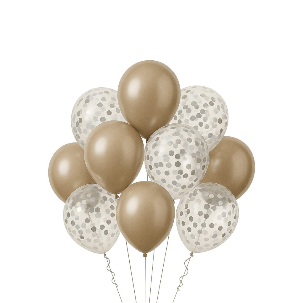 Balona me ngjyrë bronzi dhe transparente me konfeti të argjendtë. Krijojnë një dekorim modern dhe të rafinuar për çdo rast festiv.