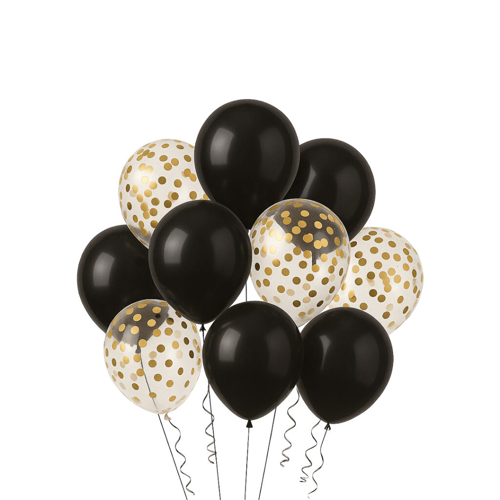 Set elegant balonash me kombinim ngjyrash të zeza dhe pika të arta. I përshtatshëm për festa, ditëlindje apo evente festive me stil modern dhe tërheqës.