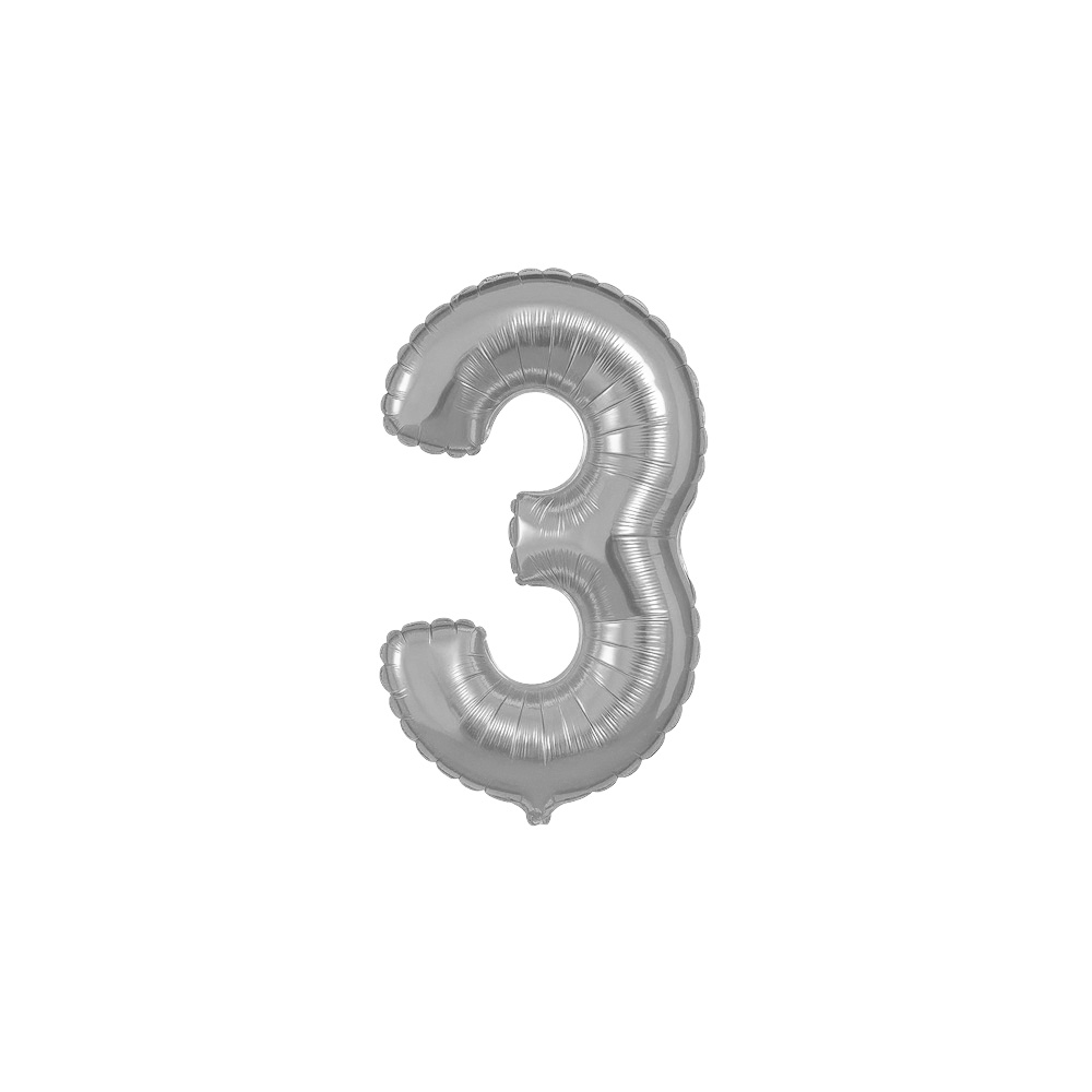 Balonë dekorative në formë numri 3 me ngjyrë argjendi metalike. Ideale për ditëlindje, përvjetorë dhe festa të ndryshme. Jep një pamje elegante dhe atmosferë festive çdo eventi.
