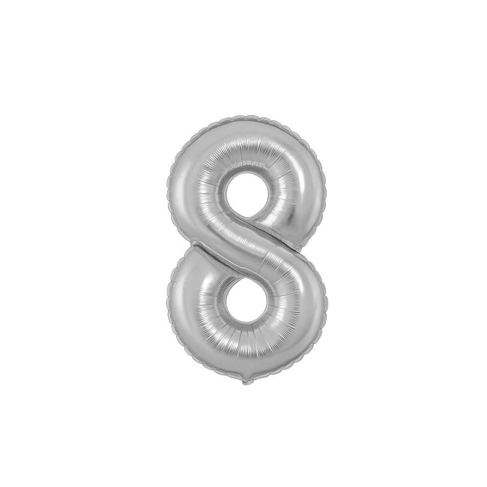 Balonë dekorative në formë numri 8 me ngjyrë argjendi metalike. Ideale për ditëlindje, përvjetorë dhe festa të ndryshme. Jep një pamje elegante dhe atmosferë festive çdo eventi.