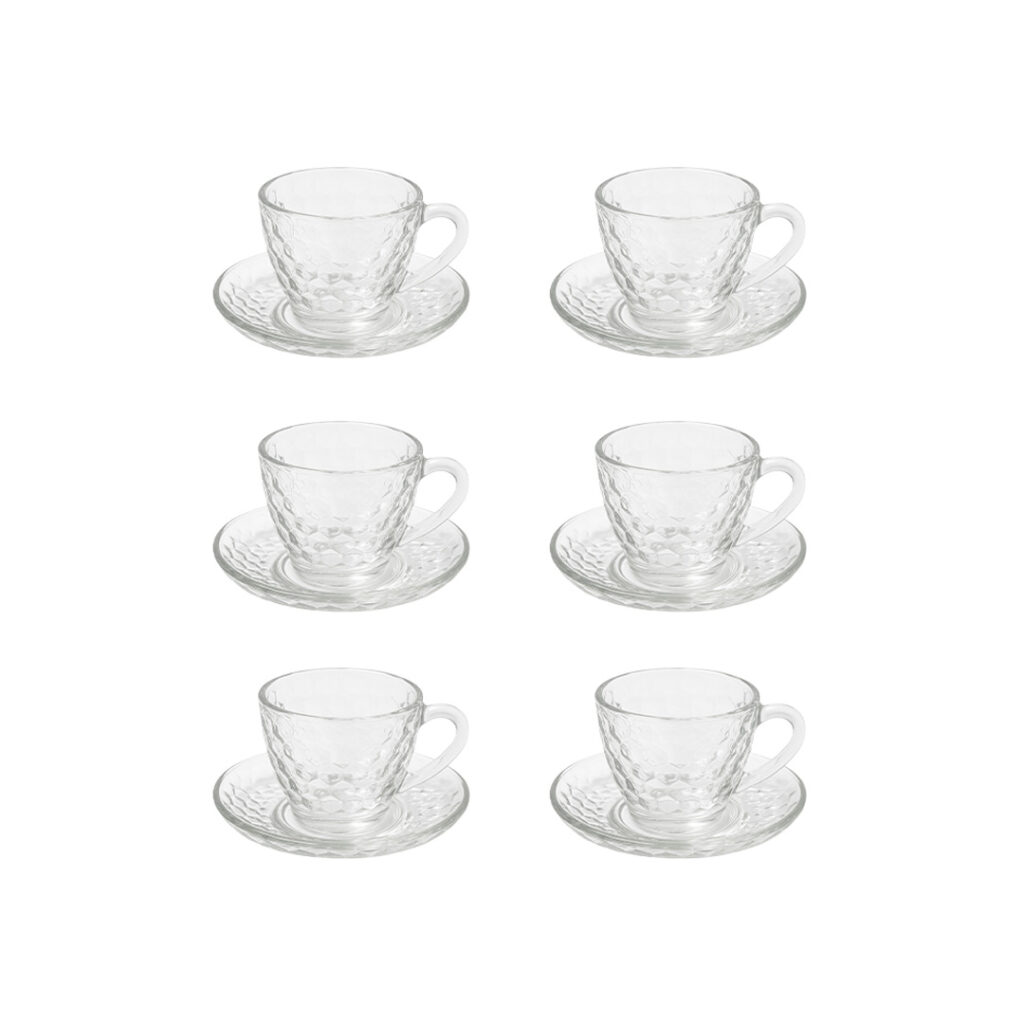 Set prej 6 filxhanësh qelqi elegant me pjatëza të dizajnuara në stil kristal. Ideale për servirjen e kafesë apo çajit me elegancë. Materiali i qëndrueshëm dhe transparent ofron ndriçim natyral dhe pastrim të lehtë pas çdo përdorimi.